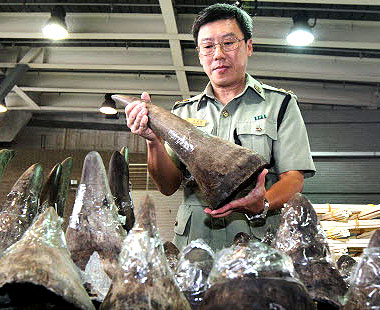 Lam Tak-fai, the Acting Head of Ports and Maritime Command, Hong Kong Customs & Excise Department, on Tuesday discusses the seizure of a total of 33 unmanifested rhino horns, 758 ivory chopsticks and 127 ivory bracelets, worth about HK$17.4 million, inside a container shipped to Hong Kong. Customs said on Tuesday they had seized a large shipment of rhinoceros horn and ivory products in a container that arrived by sea from South Africa. Officers found 33 pieces of rhino horn and 885 ivory chopsticks and bracelets, estimated to be worth HK$17.4 million, a spokesman said. The rhino horns, weighing 86 kilograms, were the largest haul ever made in Hong Kong, the spokesman said. He said the banned items had been wrapped in dark plastic and aluminium foil in an attempt to avoid detection by X-ray scanners. The container had arrived from Cape Town. No one has been arrested so far, the spokesman said. Customs officials believed the haul had been intended for trans-shipment to other parts of Asia, he said.