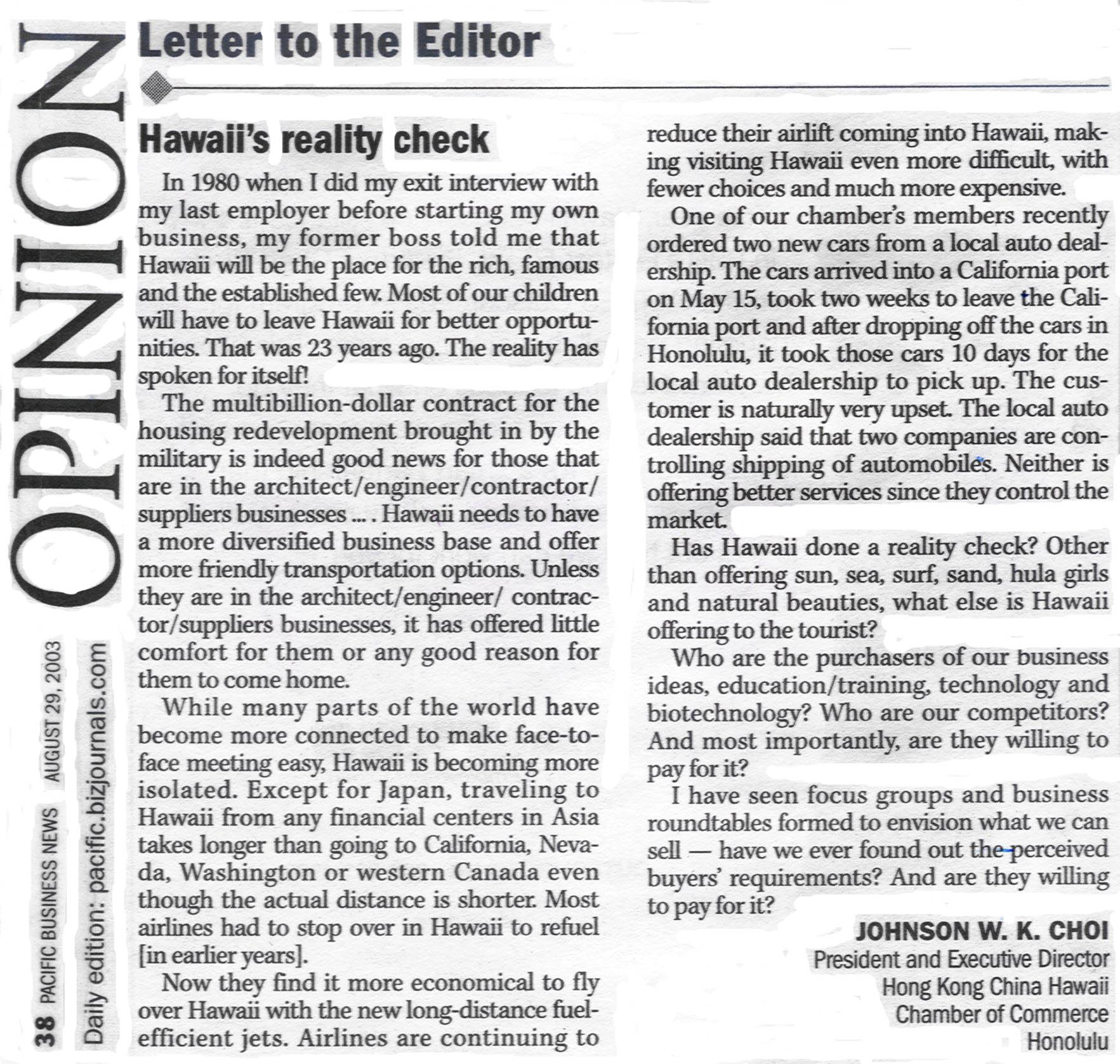 “Since there is NO visa requirements for Japanese nationals to come to Hawaii, why is Hawaii’s government not offering to help relocate Japanese nationals to Hawaii?” asked Johnson W. K. Choi, Past President/Director of the University of Hawaii Travel Industry Management Alumni.